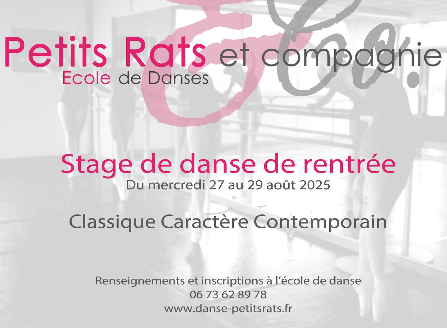 Petits Rats et Compagnie vous propose un stage de danse de rentrée : 27 au 29 août 2025. N’hésitez pas à nous contacter.